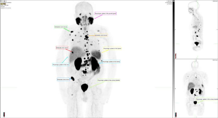 He received antiresorptive therapy (Xgeva) and multiple courses of androgen deprivation therapy (Leuprolide, Casodex, Xtandi). However, three years later, the disease progressed again, as evidenced by di use osseous activity on PSMA PET imaging.